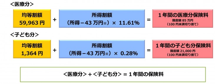 保険料は、被保険者が等しく負担する「均等割額」と、所得に応じて負担する「所得割額」の合計で計算します。